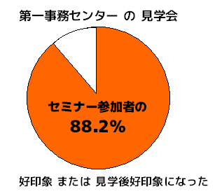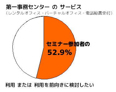 オフィスの老舗≪第一事務センター≫で内覧会を行ないました。 参加者の一部はレンタルオフィスに対して、「狭い」「暗い」「汚い」など 悪いイメージをお持ちの方もいらっしゃいましたが、内覧後なんと9割 近くの方が好印象で「キレイ」「設備が整っている」「スタッフが丁寧」 「信頼できる」などお褒めの言葉を頂き、スタッフの励みになりました。 また、独立開業をする際、第一事務センターのサービス(レンタルオフィス バーチャルオフィス・電話受付代行)を利用するかのアンケートには半分 以上の方が利用したい・利用を検討すると返答頂きました。